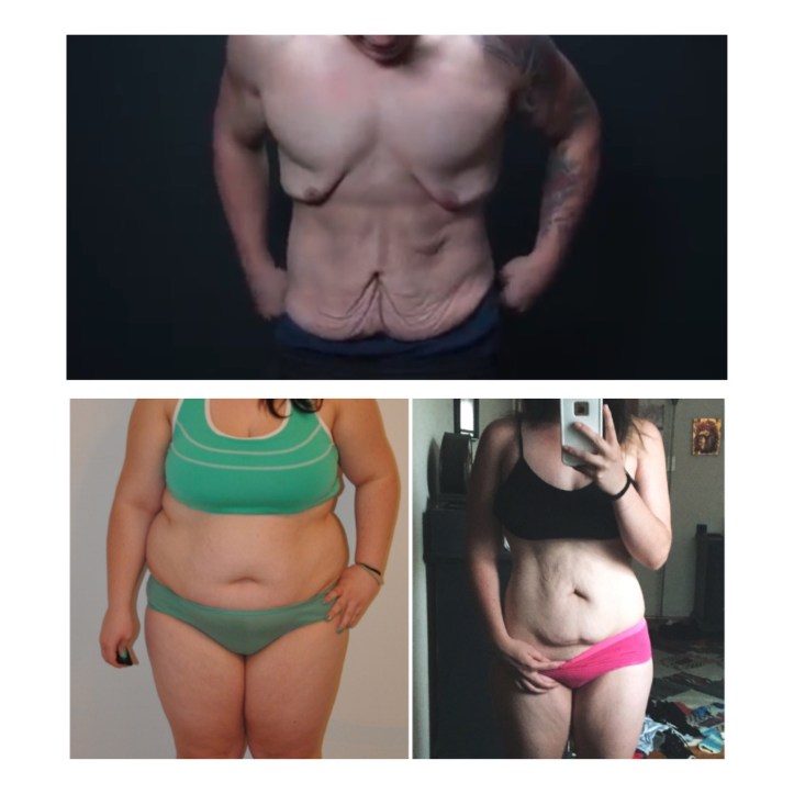 Analizojmë opsionin 1: Ajo fotoja intriguese fsheh disa të vërteta që pjesa më e madhe e individëve të cilët kanë kaluar një regjim diete për rënie të menjëhershme nga pesha nuk e tregojnë ose e fshehin. Gjendja quhet “varja e lëkurës”. Gjatë regjimeve të forta nën Kalorike trupi djeg dhjamin duke rrëzuar mbi 1-2% masë dhjamore në muaj (sasi e kosideruar e shëndetëshme për tu rrëzuar) dhe rënie nga pesha mbi 3-4 kg/muaj (peshë e konsideruar e shëndetëshme për tu rrëzuar). Nga ana tjetër lëkura edhe pse është një veshje super elastike nuk arrin të tërhiqet me të njëjtin intensitet duke mbetur e varur. Pjesët kryesore ku individët pësojnë varjen e lëkurës mbas regjimeve të forta nën Kalorike janë: