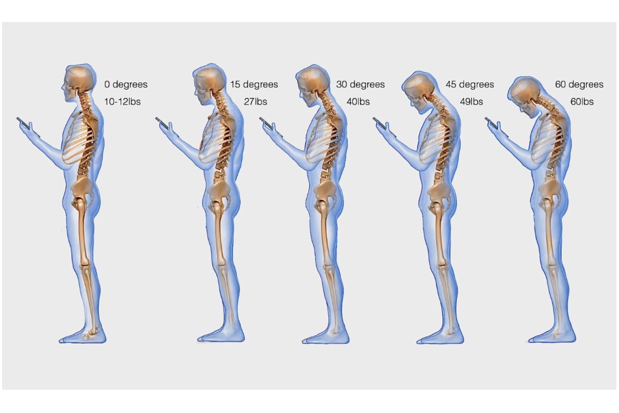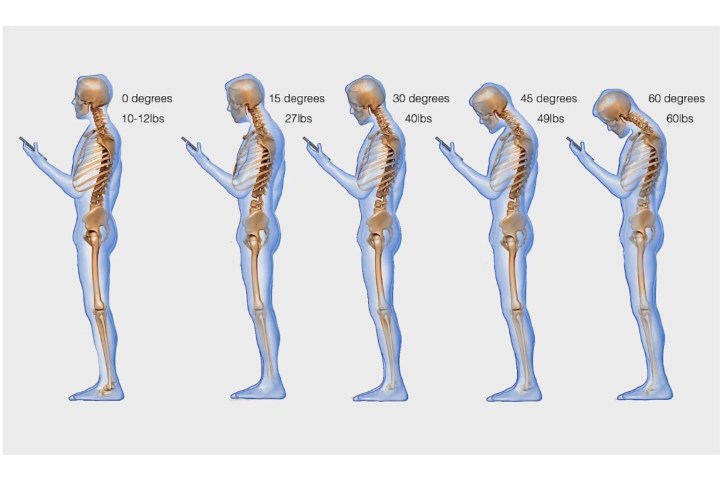 Qëndrimi drejt dhe normal i qafës ushtron presion në pjesën e vertebrave të sipërme të shtyllës kurrizore prej 4,5 kg deri 5,4 kg. Presioni tolerohet lehtësisht por shtohet nqs koka ulet dhe qafa përkulet në 30 gradë duke arritur në 18,2 kg. Zakonisht individët që përdorin për një kohë relativisht të gjatë celularin apo tablet kanë tendencën e uljes graduale të qafës duke arritur deri në 60 gradë dhe duke ushtruar presionin prej 27,3 kg. Kjo shoqërohet me mpirje të qafës dhe dhimbje të shpinës.